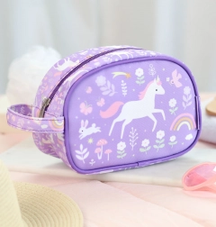 En rummelig børne-toilettaske fra A Little Lovely Company med enhjørningemotiv, perfekt til udflugter, lejre og ferier. Den har et stort hovedrum til kosmetik og hygiejne, en praktisk hank til nem transport og nem vedligeholdelse takket være håndvask.