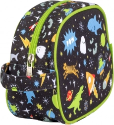 Giv børn overblik over hygiejnen – også på farten. Denne legende toilettaske med rum-motiv rummer shampoo, sæbe, tandbørste, tandpasta og små tilbehør. Takket være sidehåndtaget er den nem at bære og hænge op på badeværelset eller i bruseren.