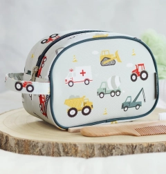 Farverigt print med biler, gravkøer og mixere på en neutral baggrund glæder hvert barn og gør det nemt at kende sin egen toilettaske.