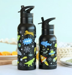 Farverige raketter, planeter og stjerner motiverer til regelmæssig væskeindtagelse og gør flasken til en favoritaccessory.