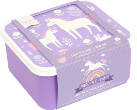Praktisk sæt med fire madkasser i fire størrelser med motiv af enhjørninger og regnbue. Boksene er lette at åbne, kan stables i hinanden for at spare plads og er ideelle til frokost, snack og småting til børnehave eller udflugter.