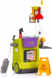 Komplet udstyr til realistisk leg: fra kost og fejebakke med børste over klude og spray til advarselsskilt. Børn har alt lige ved hånden på den praktiske vogn.