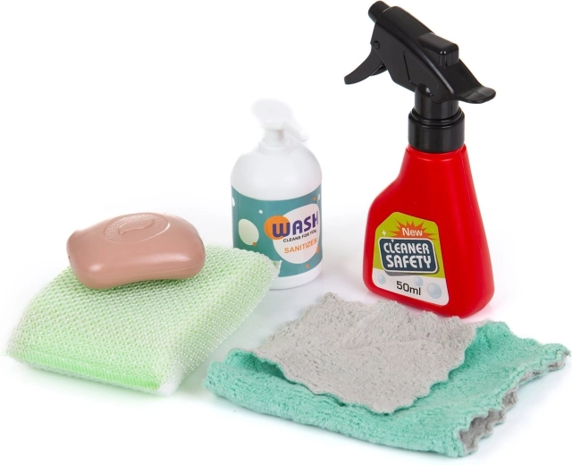 - Komplet sæt med 16 dele: vogn, kost, fejebakke med børste, rengøringsmidler, klude, advarselsskilt og yderligere tilbehør.