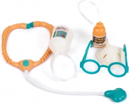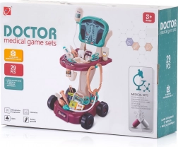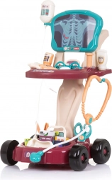 Vognen er overskueligt inddelt med hylder til udstyret og indeholder et bredt udvalg af tilbehør: stetoskop, drop, iltmaske med flaske og andre nødvendige værktøjer til små læger. Takket være hjulene og de kompakte mål 58 × 42,5 × 32 cm er den nem at flytte og stabil under legen.