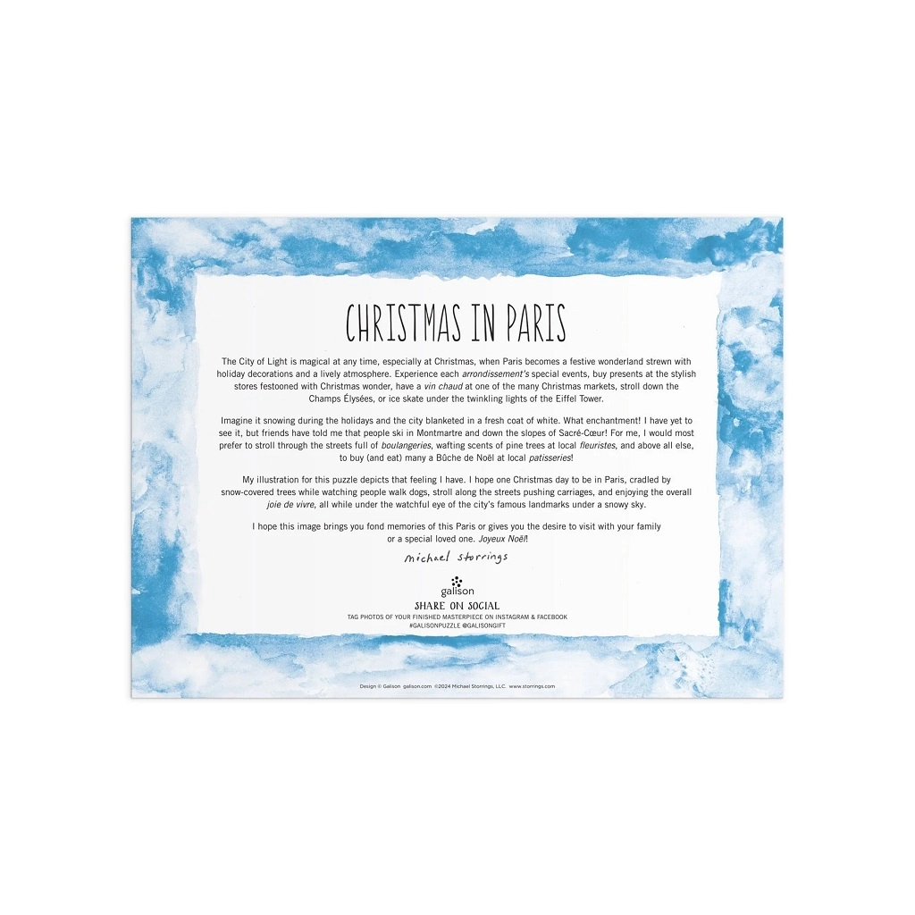 Oplev vinterens magi i Paris i Michael Storrings’ detaljerede illustration. Den rigt udførte scene fuld af lys, butikker og juleatmosfære glæder både kunstelskere og kræsne puslespilsentusiaster. Den særlige folieoverflade skinner metallisk i lyset og giver det færdige billede et unikt premium-udtryk.
