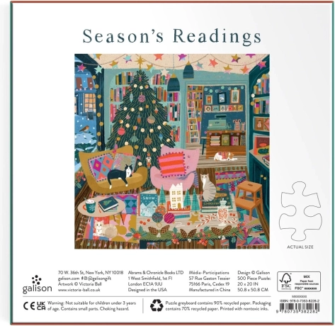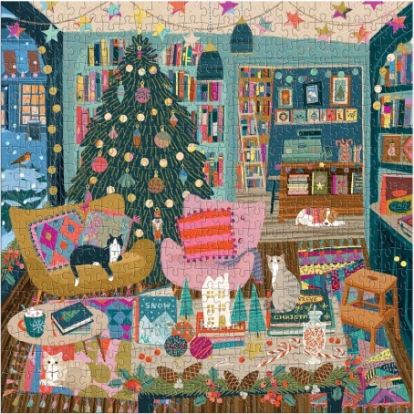 Nyd den festlige stemning med GALISON Season’s Readings, som viser et hyggeligt interiør med julepynt, bogreoler og katte. Folieeffekten giver motivet en enestående glans og forvandler det færdige puslespil til et dekorativt billede, der lyser dit hjem op – ikke kun til jul.