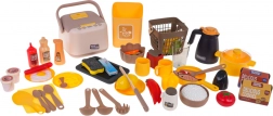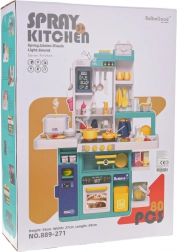 Der medfølger også åbnbar køleskab og ovn, praktiske hylder til opbevaring af mad og service, en kridttavle til indkøbslister eller opskrifter samt et lydpanel med melodier og emhætte-lyde. Riskogeren udsender desuden damp og autentiske lyde. Sættet består i alt af 80 dele til mange timers sjov.