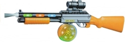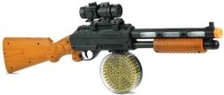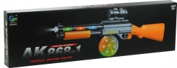 Fremragende design: Gevær AK 868-1 praler med en sort konstruktion med brune elementer der simulerer træ. Det er udstyret med et tromlemagasin til gyldne patroner og en aftagelig sigte, der gør det nemt at sigte.