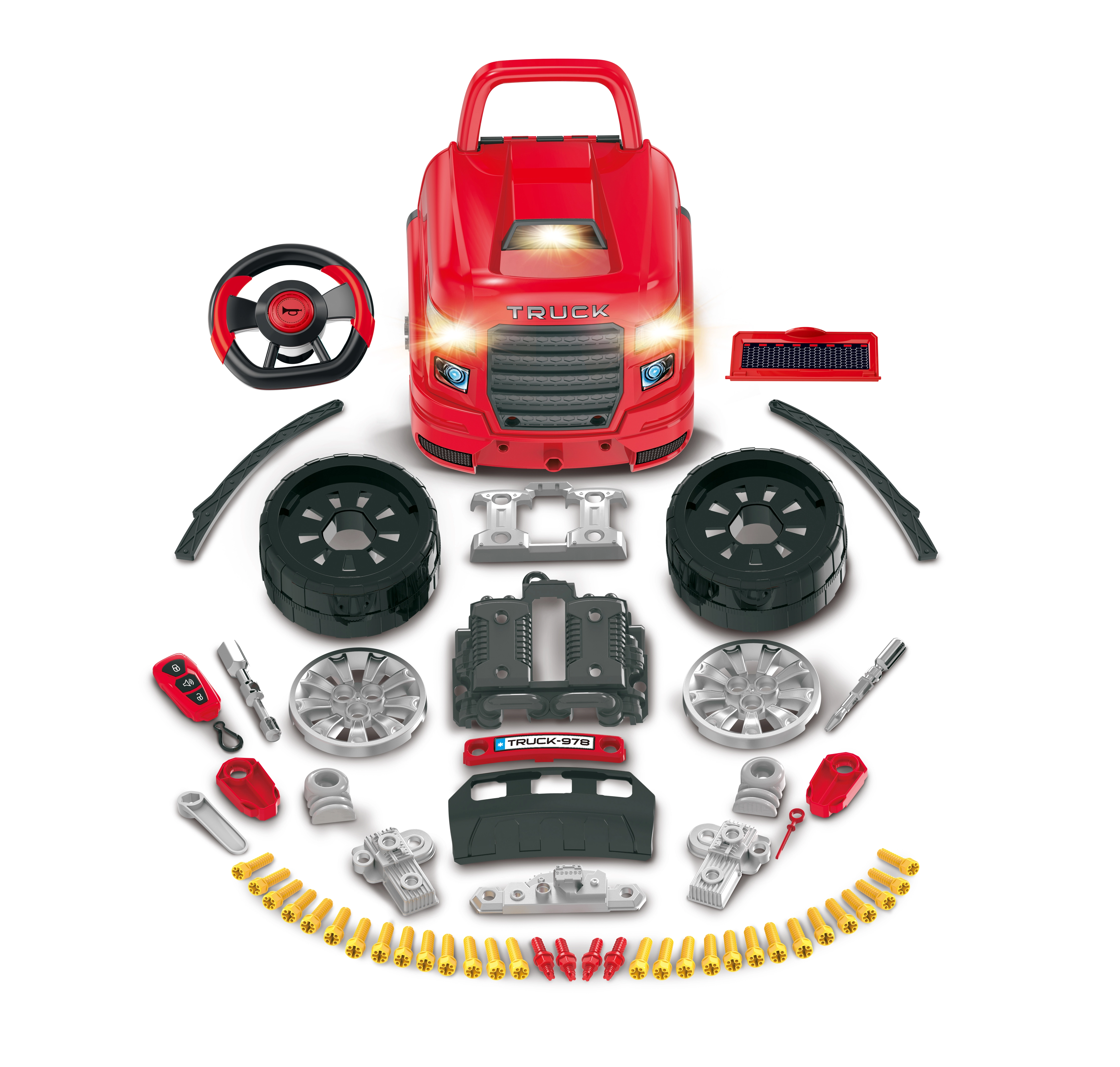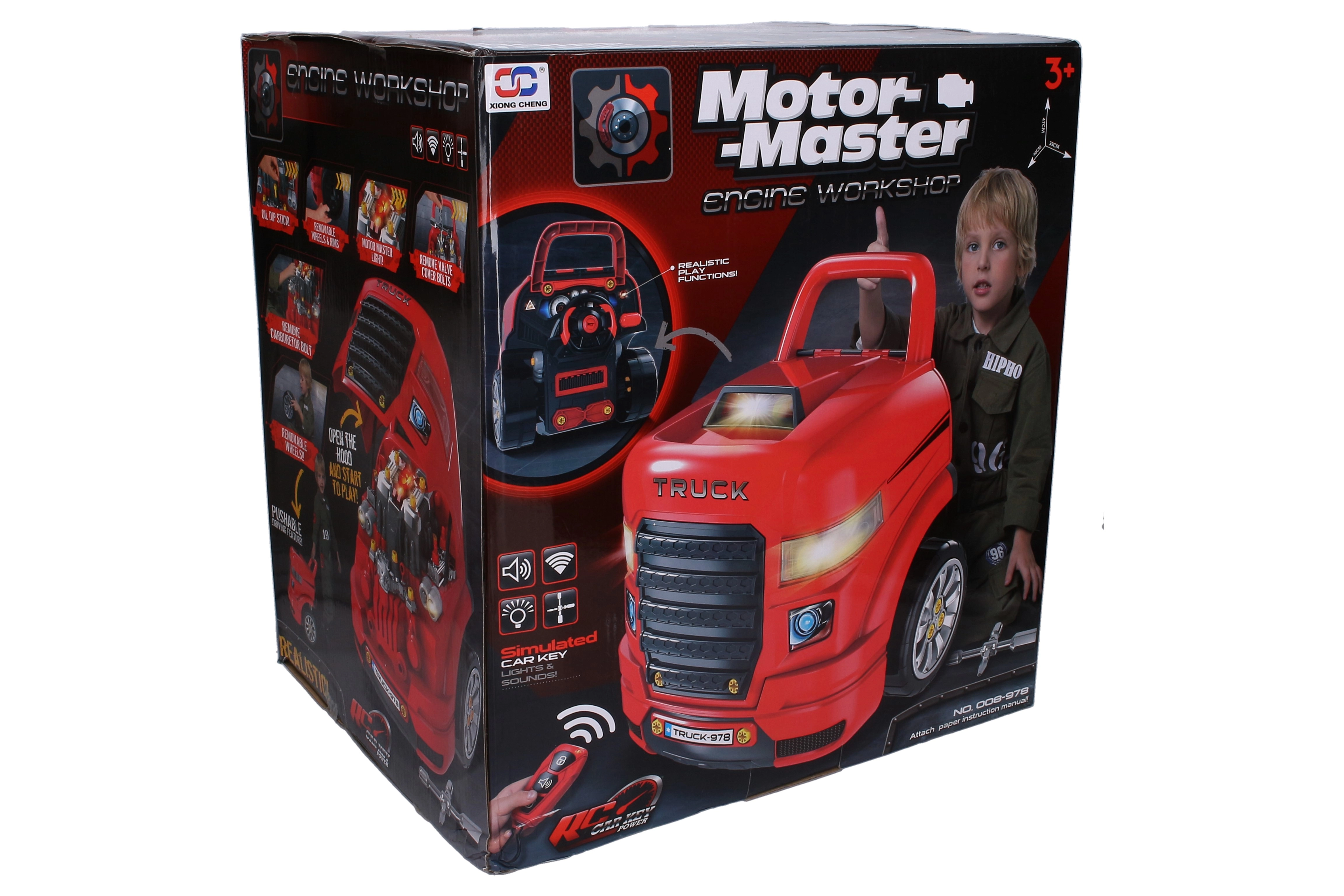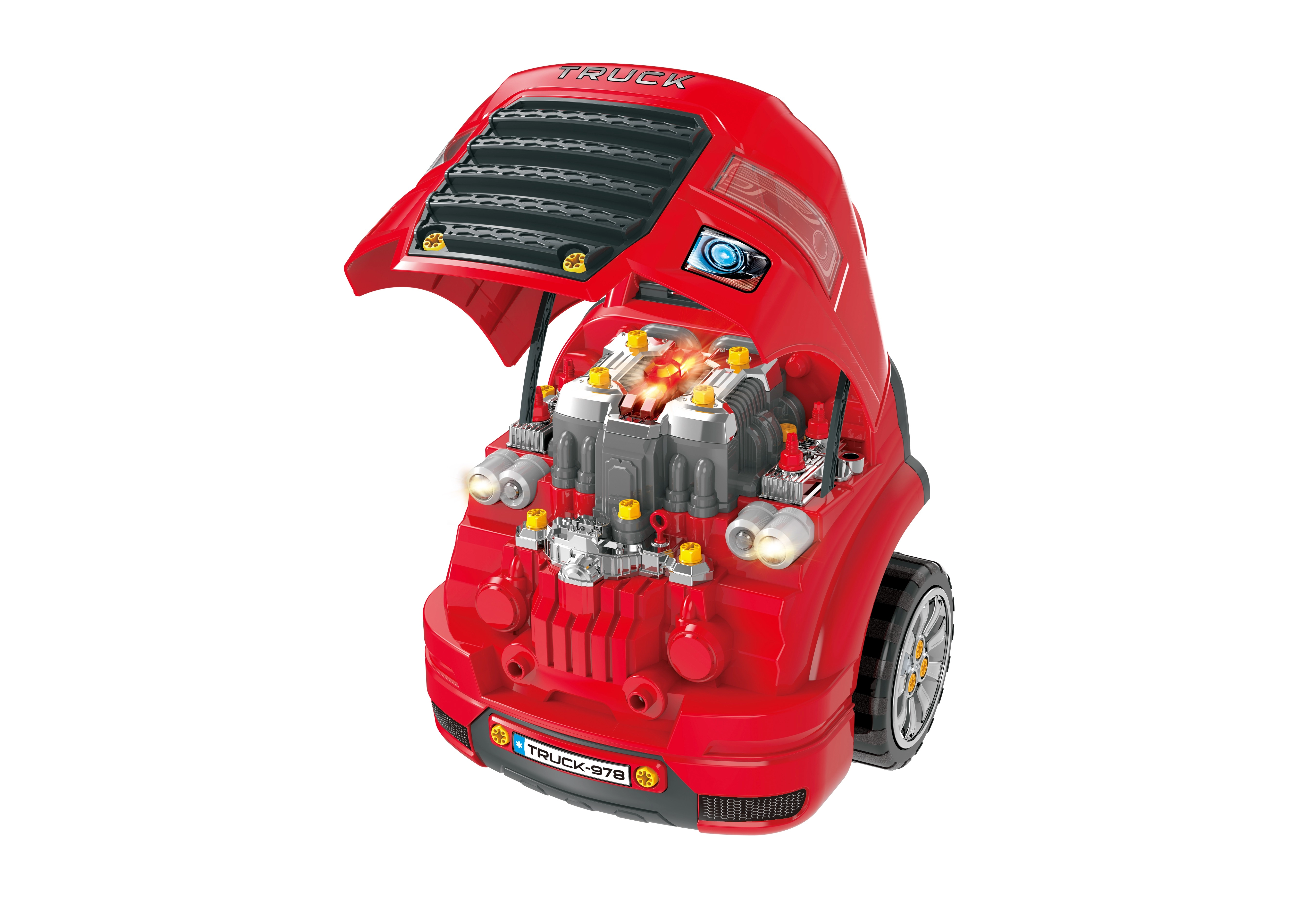 Opdag en interaktiv legeting til små mekanikere: en skruemotor til lastbil med fjernbetjening, mål 40 × 39 × 47 cm. Sættet indeholder 61 dele, lys- og lydeffekter, lysende forlygter og realistiske elementer som gearknob, horn og startknap. Der medfølger også nøgler med knapper til oplåsning og låsning.