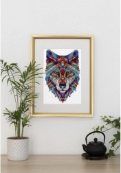 Når det er samlet, får du et farverigt ulvehoved med rige mønstre, som bliver et markant element i din indretning.