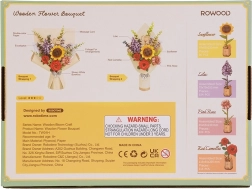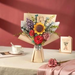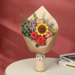 Opdag magien i en blomsterbuket, som aldrig mister sin skønhed. Træ 3D puslespil indeholder solsikke, syrener, rød kamelia, pink rose og eucalyptus. Hver blomst har justerbar højde på stilken, hvilket muliggør forskellige arrangementer.