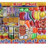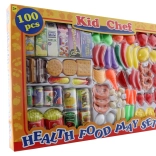 Stort mad-sæt. Pakken indeholder i alt 100 dele (frugter, grøntsager, brød, slik, dåser og kartondrikke). Pakkens mål ca. 58 × 39 × 5 cm. Alder 3+