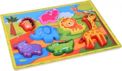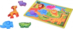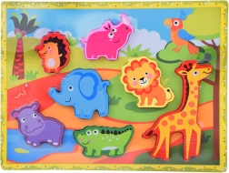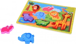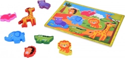 Træindlægsplade Safari er et sjovt og lærerigt legetøj for børn med smilende dyremotiver. Det udvikler observationsfærdigheder, hånd-øje-koordination og lærer navnene på eksotiske dyr.