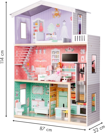 Dukkehus CAKE RESIDENCE fra ECOTOYS er en drøm, der går i opfyldelse for alle små designere. Takket være den gennemtænkte indretning kan børn fordybe sig i fantasiens verden: i stueetagen er der badeværelse og køkken, første sal fungerer som en hyggelig stue, og på øverste etage finder du soveværelse med terrasse. Den åbne konstruktion giver let adgang til alle rum og indbyder til fælles leg.