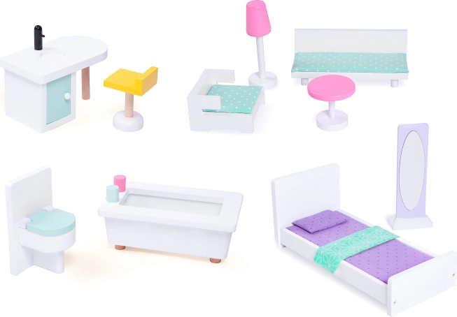 Pakken indeholder 10 stykker trømøbler, som frit kan flyttes og kombineres. Den bevægelige elevator forbinder etagerne og giver legen et realistisk præg. Den præcise udførelse i stabilt træ og sikre kanter gør dukkehuset til et holdbart legetøj i mange år.