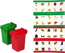 Farvede skraldespande og kort med genstande gør legen til en lærerig aktivitet fuld af sjov.