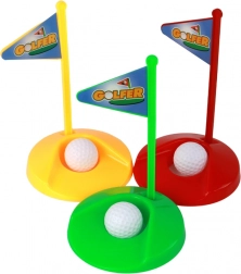 Dette farverige minigolf-sæt indeholder alt, hvad børn behøver til spillet: 3 holdbare køller (ca. 52 cm), 3 huller i farverne grøn, rød og gul, 3 startflag og 3 hvide bolde (diameter ca. 3,5 cm). Hver kølle har en forskellig køllehovedform, hvilket tilføjer strategi og variation til spillet.