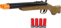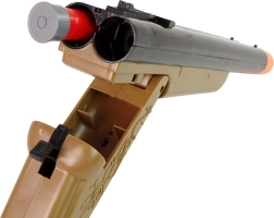 Geværet ligner præcis det, som cowboys har i westernfilmene. Midt på våbnet er der en håndtag, der kan folde det på midten. Dette muliggør indførelsen af de store patroner. Med en glidende bevægelse opad lukker man den igen, og så er den klar til skydning. Indeni er der to huller til patroner, du kan skyde to skud ad gangen. De skyder ikke samtidig, to aftrækkere gør det muligt at skyde ét efter ét. Haglgeværet giver kun lydeffekter, og der kommer intet ud af løbet, hvilket sikrer sikkerhed for dit barn.