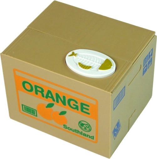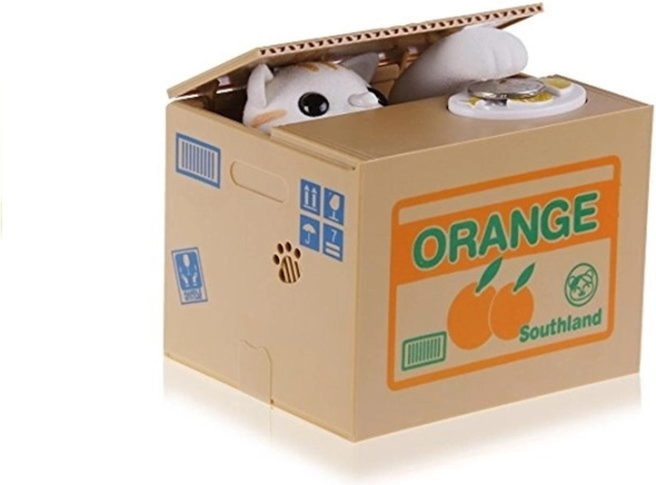 Tryk på knappen på kassen, og katten løfter låget og trækker pengene ind med poten.