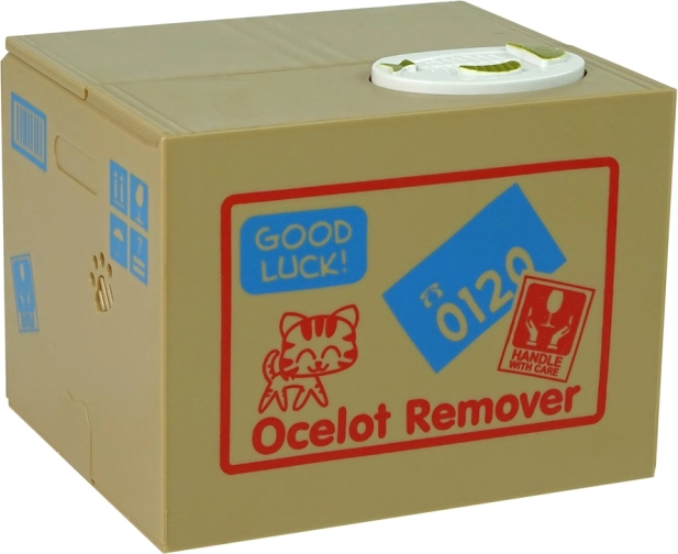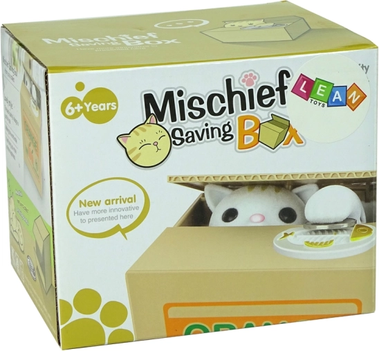 Med dette fantastiske legetøj lærer dit barn at spare penge på en sjov måde. Når knappen trykkes, aktiveres en mekanisme, hvor katten løfter låget på sparebøssen og trækker mønterne ind med poten.