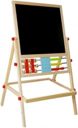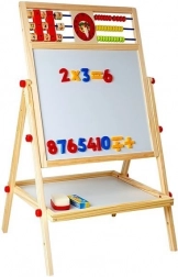 En tavle er uundværlig – en lille kunstner vil udvikle sine kreative evner ved at tegne med kridt, og kan også lære at skrive og regne. Den er udstyret med en praktisk hylde til tilbehør. Robust fremstillet af materialer af højeste kvalitet. Omhyggeligt forarbejdet uden skarpe kanter. Brug kridt til at tegne på den sorte side af tavlen – der medfølger tre farver i sættet. Den har en kugleramme med 3 farver kugler, som barnet kan starte regneeventyret med, og på den anden side trækubusser med tal, så grundlæggende regnearter nemt kan udføres. Med tal og matematiske symboler på magneter kan barnet lære de grundlæggende regnearter som addition, subtraktion og multiplikation. I midten er der et ur, hvor den lille kan indstille tiden med viserne og lære at kende klokkeslæt.