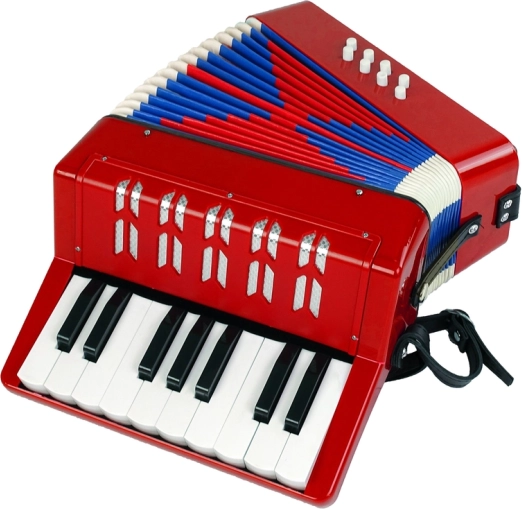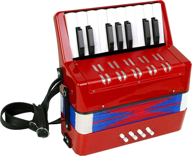Børneakkordeon med 17 tangenter og 8 baser. Udvikler motorik og musikalsk øre, let at betjene, ideel gave fra 3 år. Realistisk udseende og lyd.
