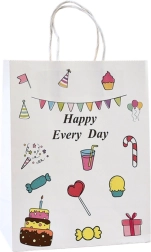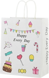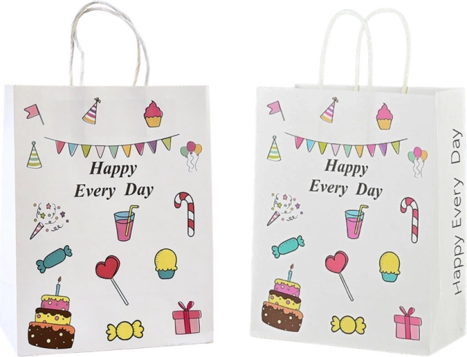 Denne papirpose er pyntet med farverige grafikker og teksten "Happy Every Day", hvilket gør den velegnet til en bred vifte af fester som fødselsdage, sammenkomster eller arrangementer med familie og venner.