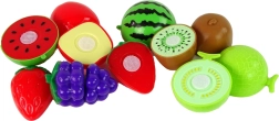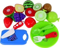 Plastfrugter som jordbær, kiwi, melon og flere i flotte farver - let at skære med den medfølgende kniv.