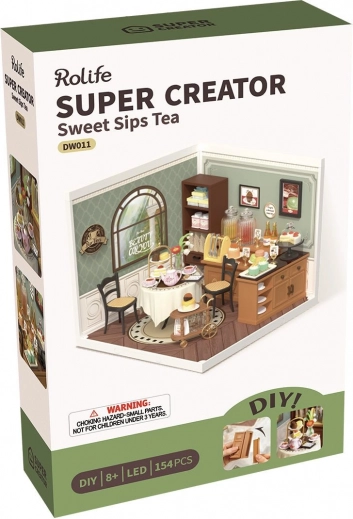 Miniaturen Søde Tesalon er ideel, når du ønsker stilfuld afslapning i et miljø med nostalgisk atmosfære, komplet med rundt bord med blonde-dug, kopper og tallerkener fulde af søde sager. Nemt at samle uden brug af lim, understøttet af præcist udskårne dele, der nemt klikker sammen.