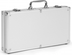 Sættet leveres i en robust metal kuffert, hvilket gør den ideel til transport. Kufferten er låsbar (indeholder to nøgler), hvilket forhindrer utilsigtet åbning og spredning af spilleelementer.