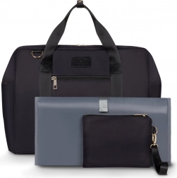 Pakken indeholder et praktisk skifteunderlag til hygiejnisk bleskift og en toilettaske til kosmetik eller småting – alt afstemt til et elegant sæt.