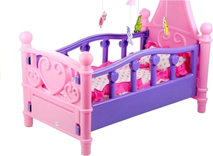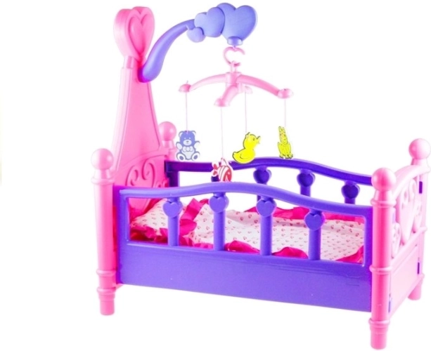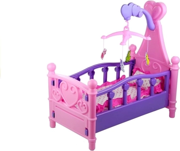 Denne stilfulde dukkeseng minder troværdigt om en rigtig børneseng. Den pink‑lilla udgave med hjerter og ornamenter suppleres af en karrusel med hængende dyr, som hjælper dukken med at falde i søvn. Sættet inkluderer blødt sengetøj, der matcher sengens design.