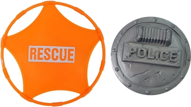 Skive og badge med redningstema stimulerer børns fantasi og historier under politiindsatser.