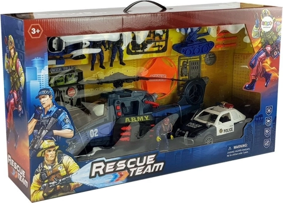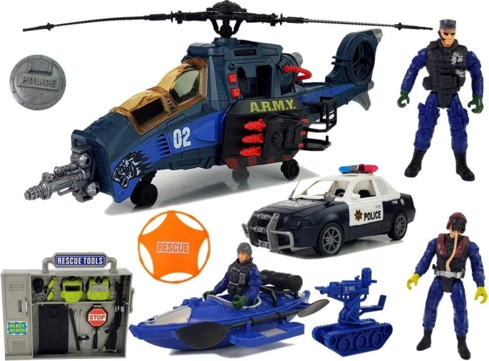 Stort politilegesæt til børn, der byder på actionfyldt leg med en kæmpe helikopter (rotorspændvidde op til 48 cm), lys- og lydeffekter, politibil og kajak. Realistiske lyde ved start og landing, effekter i cockpittet og masser af tilbehør understøtter fantasi og rolleleg for små politibetjente.