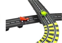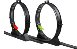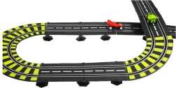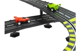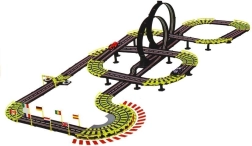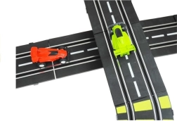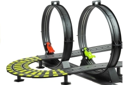 Denne store plast-racerbane bringer adrenalinfyldte løb direkte ind i stuen. Takket være 230 V netstrøm slipper du for batterier og kan køre uden afbrydelser. To separate spor med omgangstællere lader jer køre på tid som i Formel-løb og kæmpe om hver hundrededel.