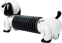 Den robotiske hund er designet med fokus på fremtidens teknologi. Dens sort-hvide look med harmonikaeffekt giver bevægelighed og fleksibilitet.