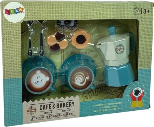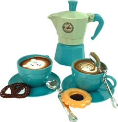 Dette børne-kaffesæt i en smuk turkis farve er ideelt til at lege café eller holde et lille hjemmebesøg for gæster. Sættet indeholder farvede mønstre til kaffen, så små baristaer kan lave kaffe med forskellige dekorationer. Kaffemaskinen i sættet hjælper med at få det hele til at se professionelt ud.