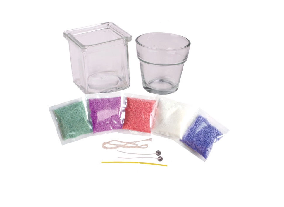- 2 glasbeholdere til lys, 5 farvede vokse, væge, pind