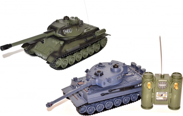 Kast dig ud i en krigskamp! Styr kampvognen og find din fjende! Kør gennem krævende terræn! Overlist din modstander og skyd ham ned! Den, der bliver ramt af fire skud, taber! Ægte sjov for drenge og mænd. hver kampvogn kører på en anden frekvens – 27 og 40 MHz roterende tårn lyd- og lyseffekter strømforsyning 4,8V batteripakke – opladning til elnettet Størrelse: 25 cm (uden kanon) Anbefalet alder: fra 6 år