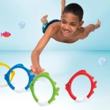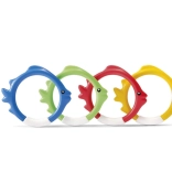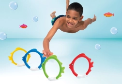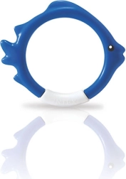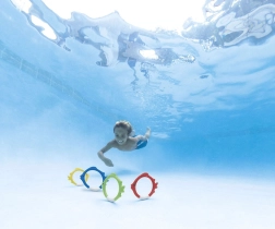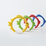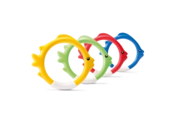 Sættet af IN TEX dykkeringe formet som fisk er et ideelt redskab til legende indlæring af dykning. Takket være de markante farver og den stabile opstilling på poolbunden finder børnene nemt målet og træner lystbetonet både vejrholdning og orientering under vand.