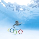 Når ringene kastes i vandet, stiller de sig automatisk op på bunden, så børnene har et tydeligt mål for neddykning og øver at dykke på en naturlig og sjov måde.