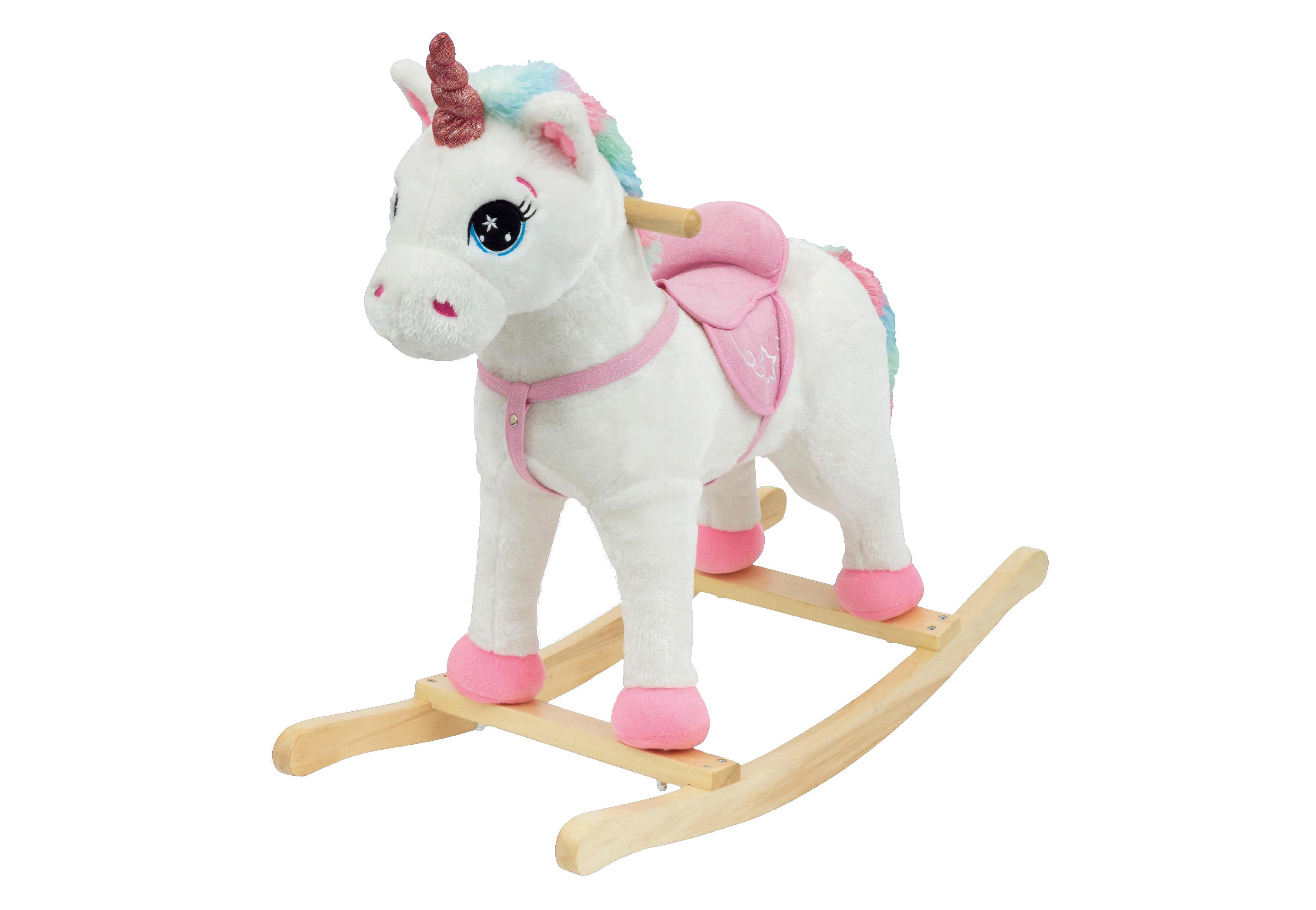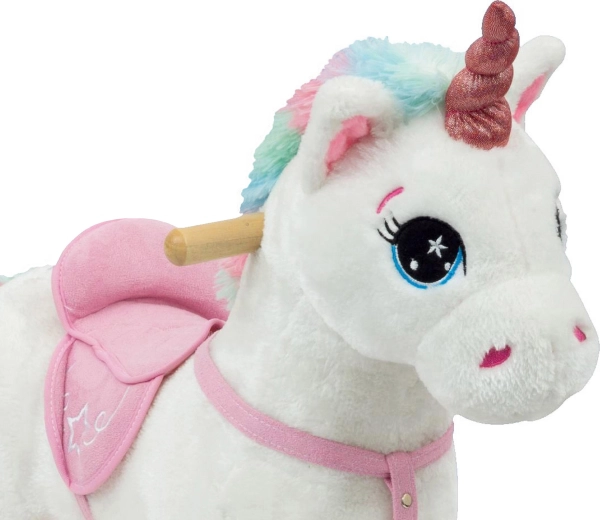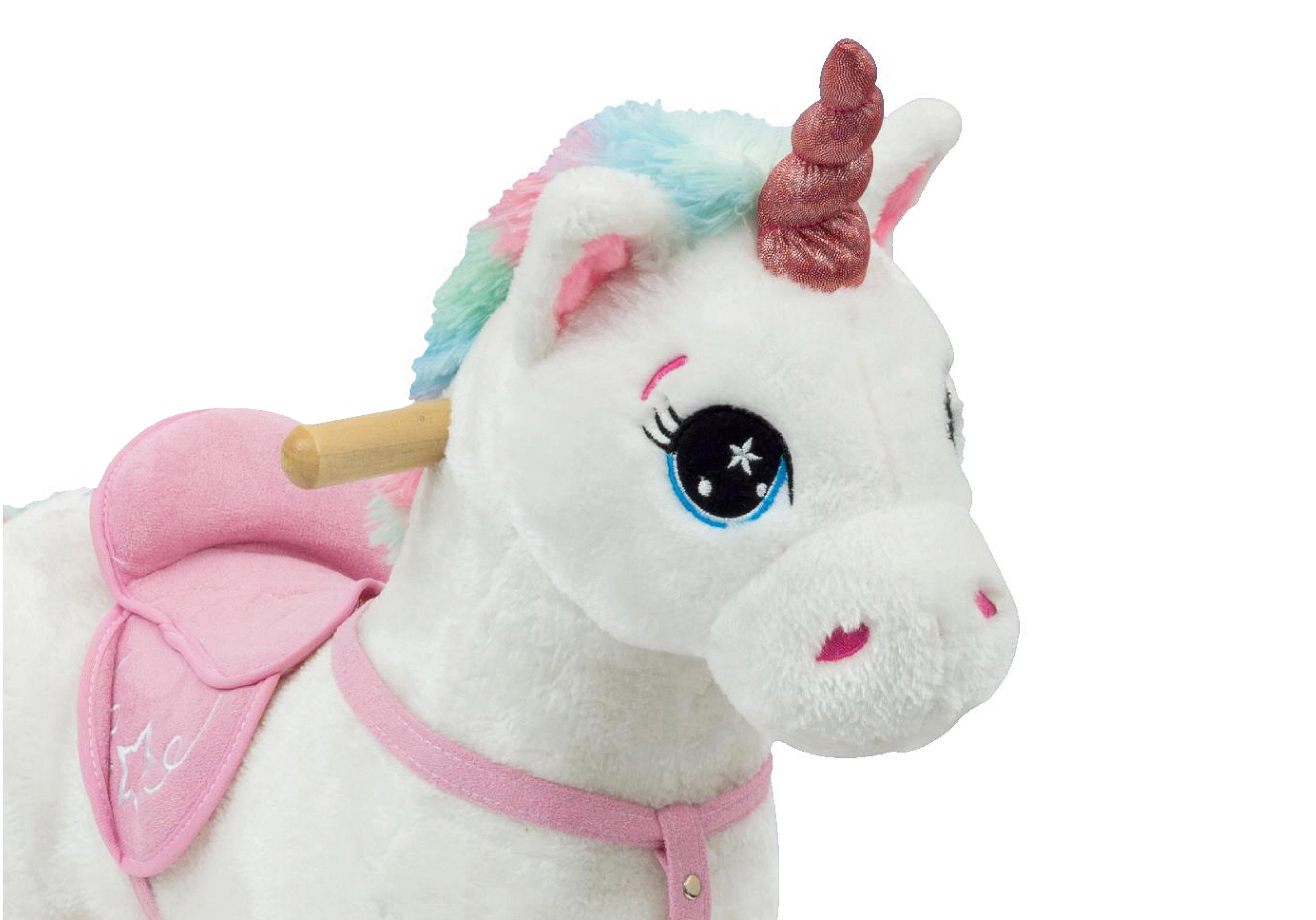 Denne charmerende gyngende enhjørning i hvidt og lyserødt vil begejstre hvert barn. Den bløde plys er behagelig at røre ved, den træbaserede gyngebund giver stabilitet, og de integrerede lydeffekter understreger den magiske køreoplevelse. Ideel til børn fra 3 år, der vil lege og samtidig udvikle motorik og balance.