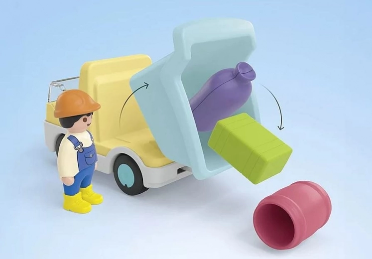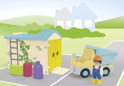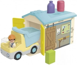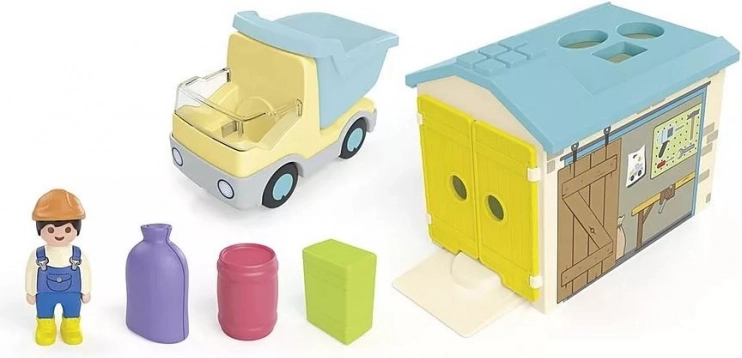 - Garage med sorteringspanel, lastbil med krog og vippekasse, arbejderfigur, lastdele (sæk, kasse, tønde)