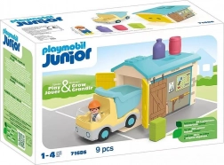 Dette sjove byggesæt er ideelt til små bygmestre. Garagen med panel til form-sortering lærer børn at genkende former og farver, mens den robuste lastbil med krog og bevægelig vippekasse understøtter kreativ rolleleg. Barnet lærer, hvilken form der passer i hvilken åbning, og opdager selv rækkefølgen, som delene lander på ladet.
