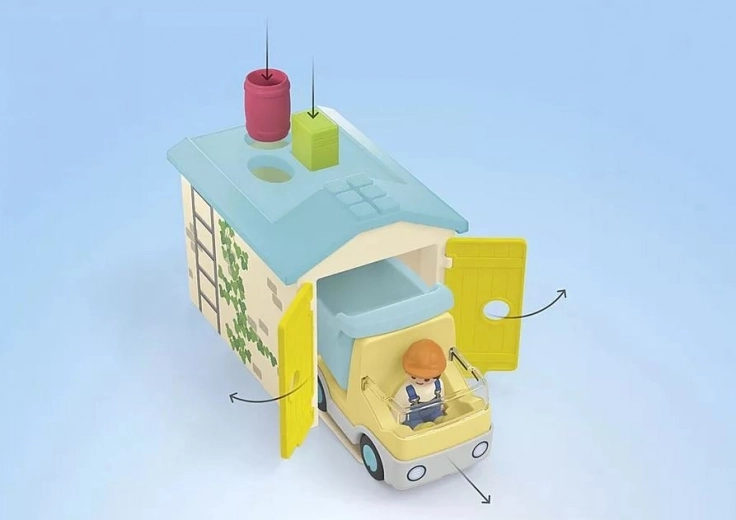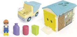 Udforsk byggeuniverset med dette legesæt til de mindste! Lastbil med garage og form-sorteringsfunktion udvikler finmotorik, logisk tænkning og hånd–øje-koordination. Barnet kan læsse sæk, kasse og tønde gennem de rigtige åbninger i garagen, sætte arbejderen i førerkabinen og køre ud på “byggepladsen”. Når arbejdet er færdigt, kan læsset nemt tømmes med den vipbare ladkasse.
