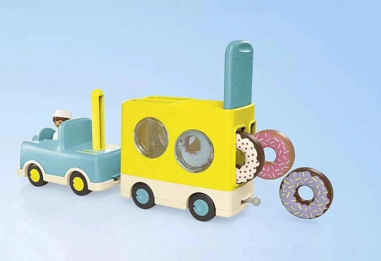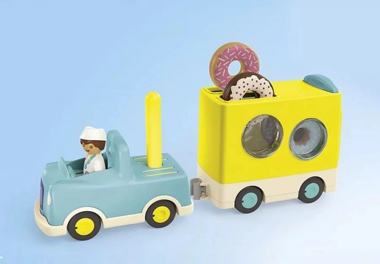 Dette farverige sæt introducerer børn til rolleleg: Chaufføren i den blå bil trækker en gul trailer pyntet med store donuts. Børn kan stable og sortere donuts, bruge fantasien og finde på egne historier om et rullende bageri.