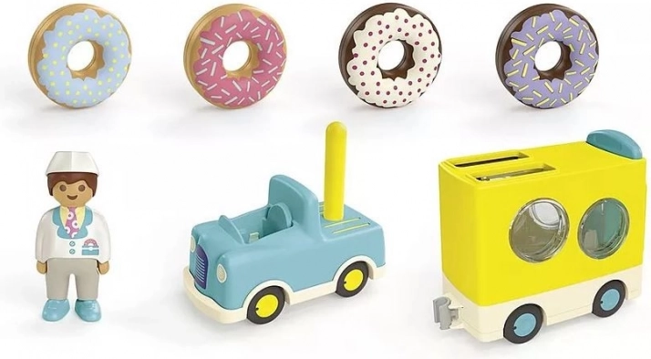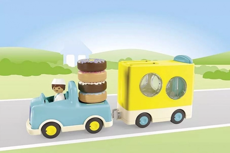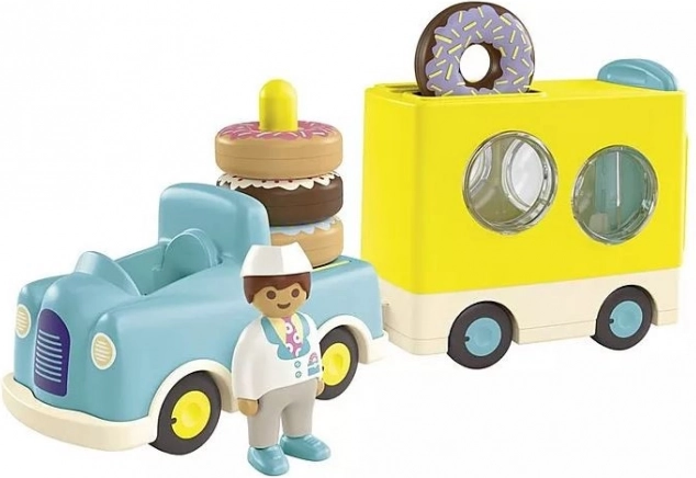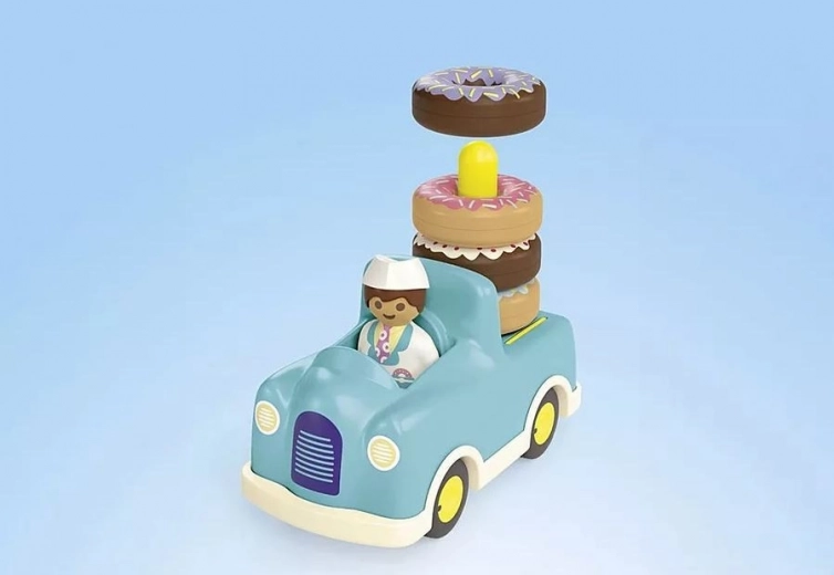 Oplev et sjovt sæt til de mindste – PLAYMOBIL 1.2.3 skør donut-lastbil med figur, lille bil og trailer med stablings- og sorteringsfunktion. Understøtter finmotorik, farve- og formgenkendelse og giver sikker, kreativ leg for børn fra 1 til 4 år.