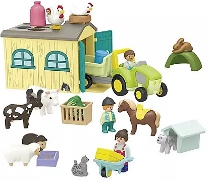 Traktoren med krog og trailer med nedklappelig side klarer enhver opgave. Den voksne figur kan skubbe trillebøren, barnet kan sætte sig op på ponyen, og sammen kan de tage sig af dyrene og gårdspladsen. Sættet kan kombineres med andre gårdsæt for en endnu større fantasiverden.