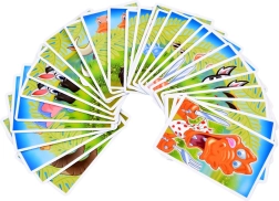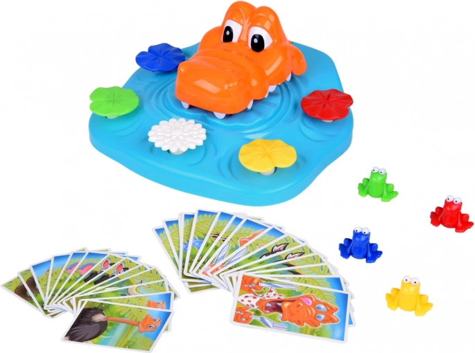 - krokodille med spillebase, farverige frøer, kortbunke, vejledning