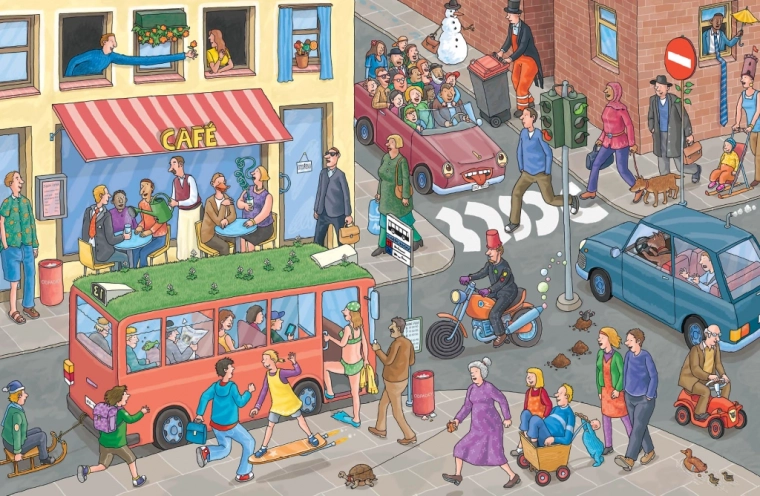 By-scener med uventede twists udvikler fantasien og underholder også voksne. Ideel til fælles opdagelse af detaljer.